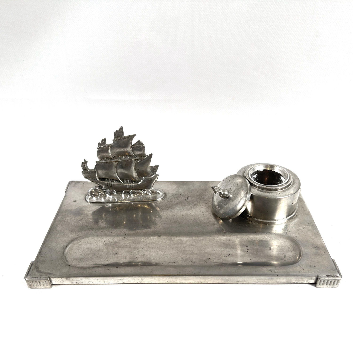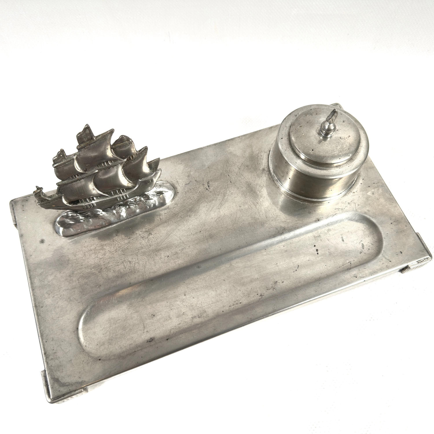 The inkwell lifts out, making this an appealing piece even when used purely for display. Ideal for collectors of vintage desk sets, nautical decor, or pewter objects. A timeless piece that brings maritime character to any workspace or study.
