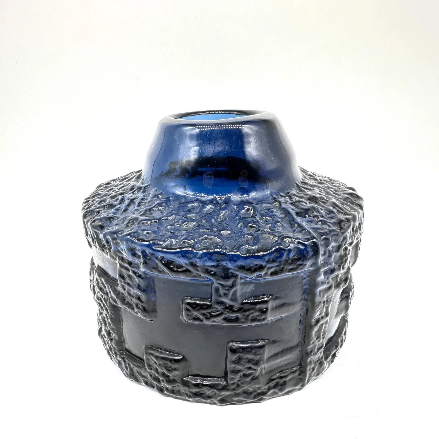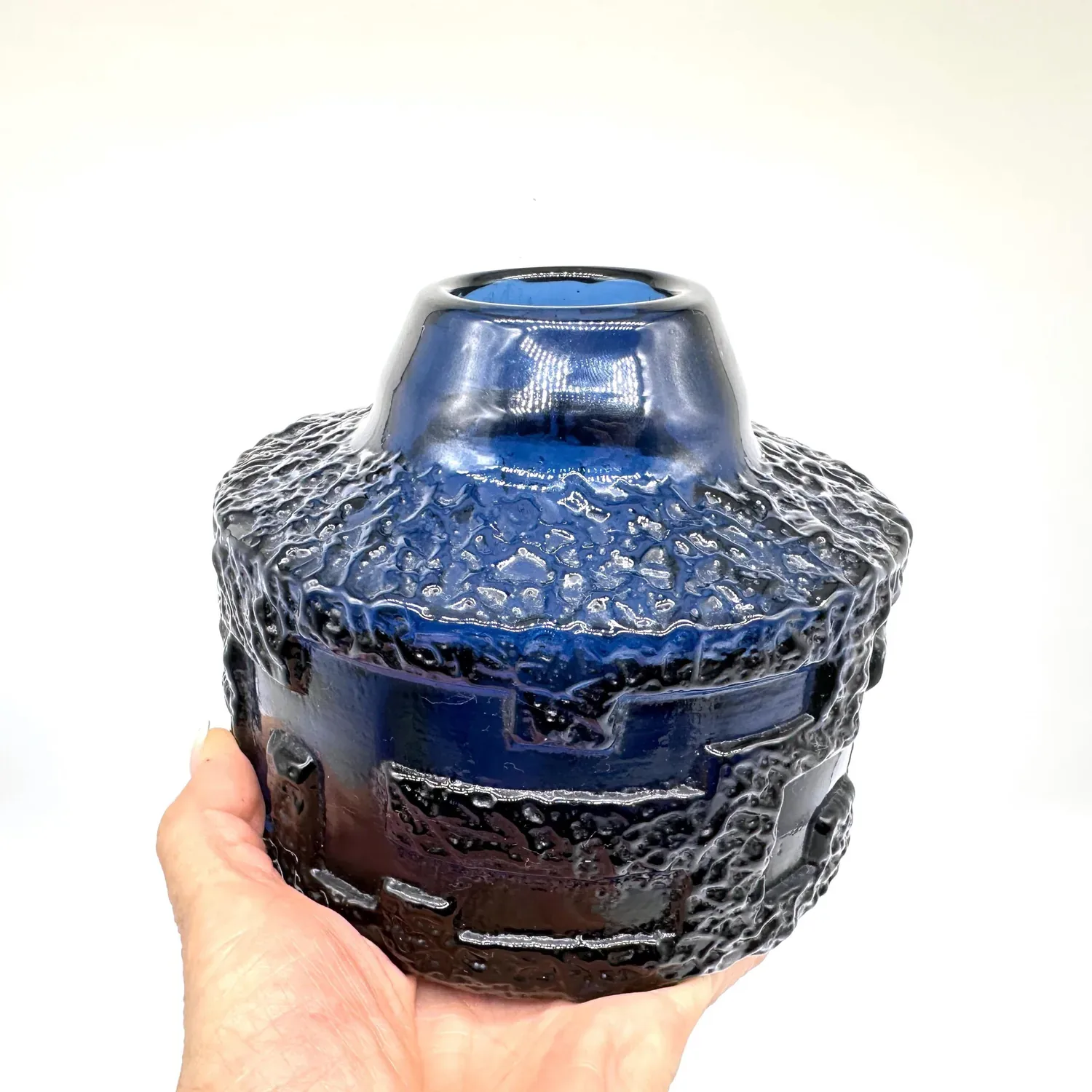 Experience the raw power of Scandinavian brutalist design with this extraordinary cobalt blue glass vase by Göte Augustsson for Ruda Glasbruk. This mid-century masterpiece showcases the dramatic lava-like texture and bold architectural forms that define the brutalist movement in Swedish glass art.