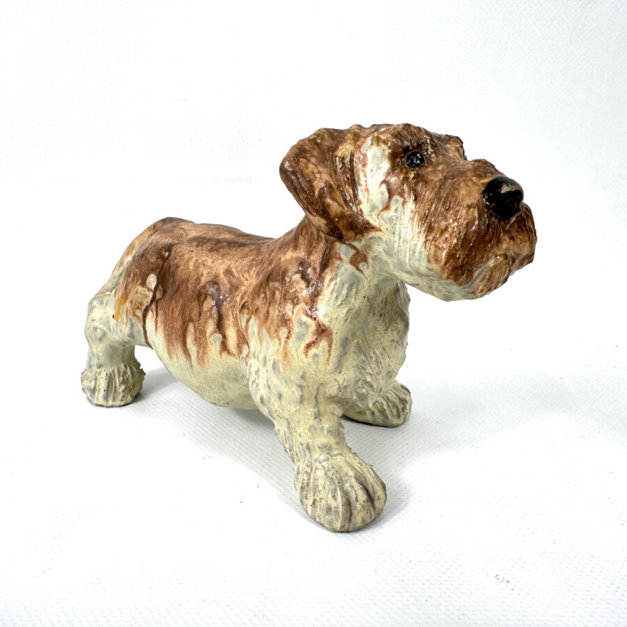 A charming hand-crafted ceramic dog figurine by JIE Gantofta, Sweden. This expressive little sculpture features a textured glaze in warm brown and cream tones, capturing the character and stance of a lovable terrier-type dog. The detailing around the face, paws, and coat is typical of JIE Sweden’s studio style.