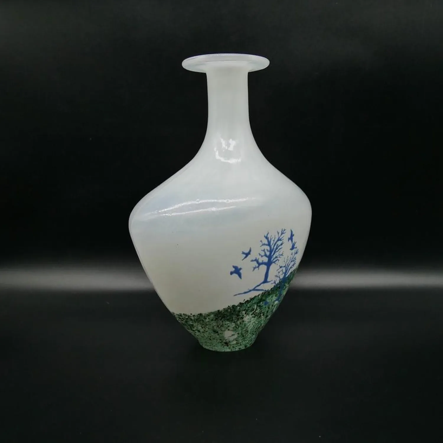 Experience the mastery of Swedish art glass with this exceptional Kosta Boda vase from Kjell Engman’s celebrated “October” series. This stunning piece captures the essence of autumn through delicate tree silhouettes and graceful bird motifs, showcasing the renowned craftsmanship that has made Kosta Boda a global symbol of Scandinavian design excellence.