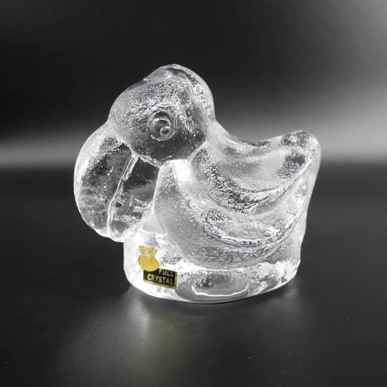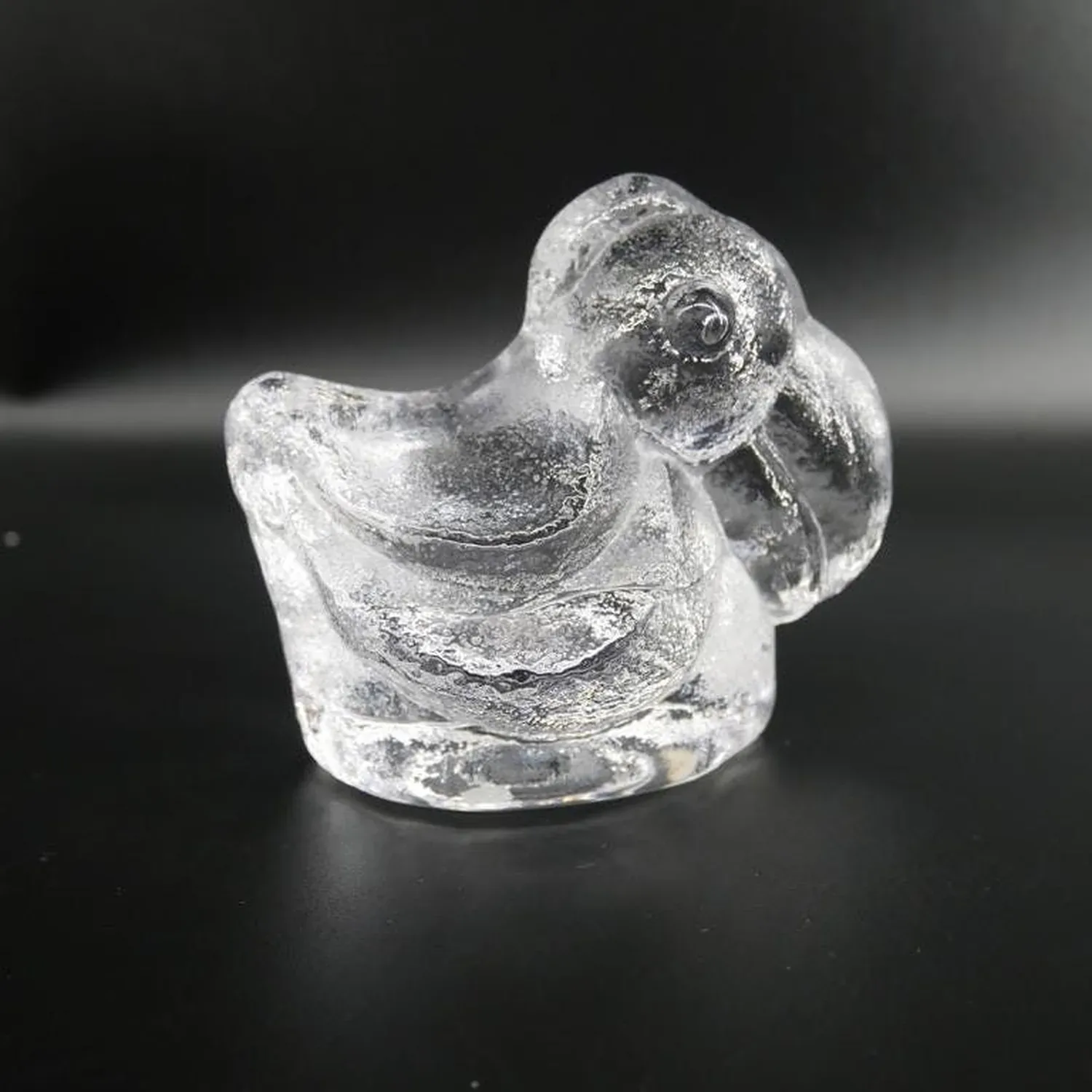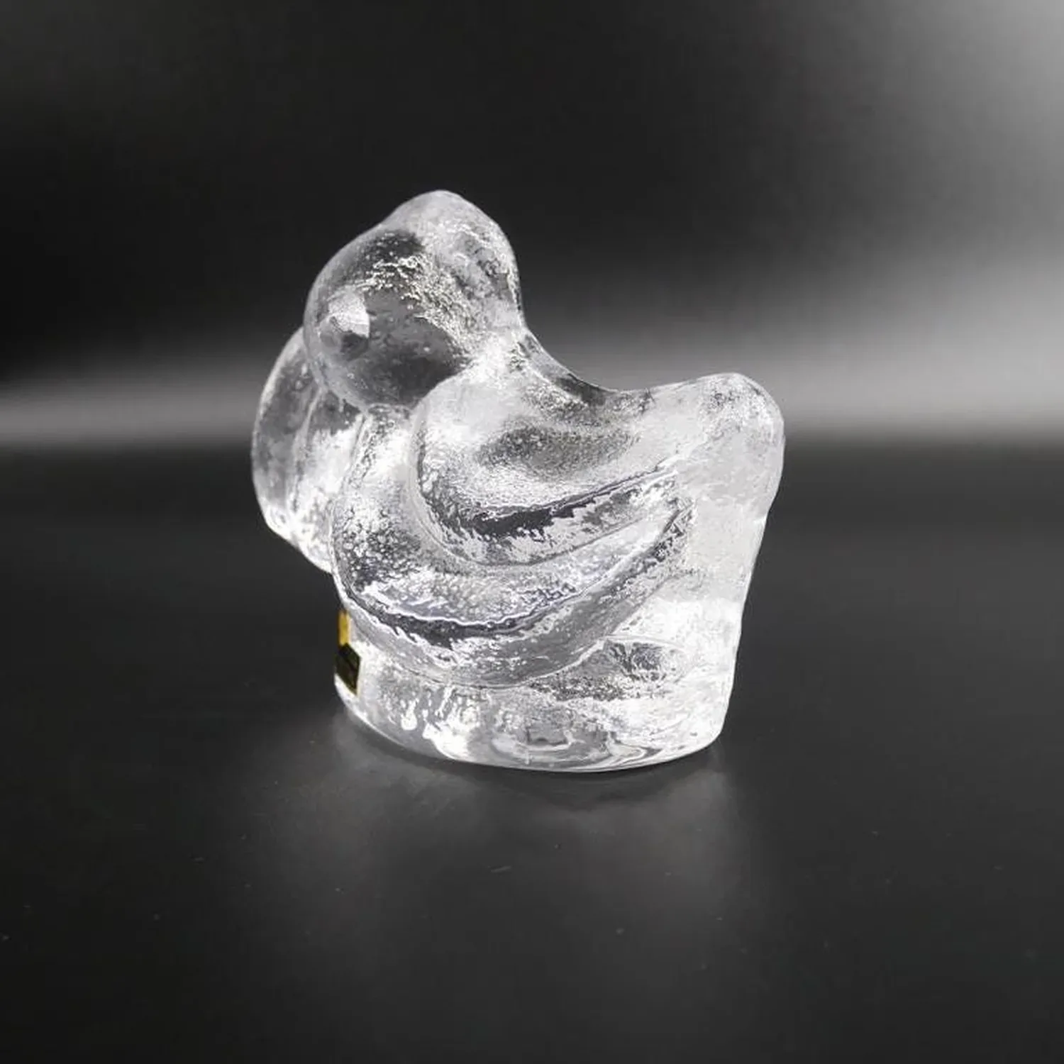 Magnificent brutalist glass duck sculpture by renowned Swedish designer Lars Hellsten for Skruf Sweden. This striking piece exemplifies the bold, sculptural approach of 1970s Scandinavian glass art, featuring the distinctive thick-walled construction and organic form that made Hellsten a celebrated figure in Swedish design.