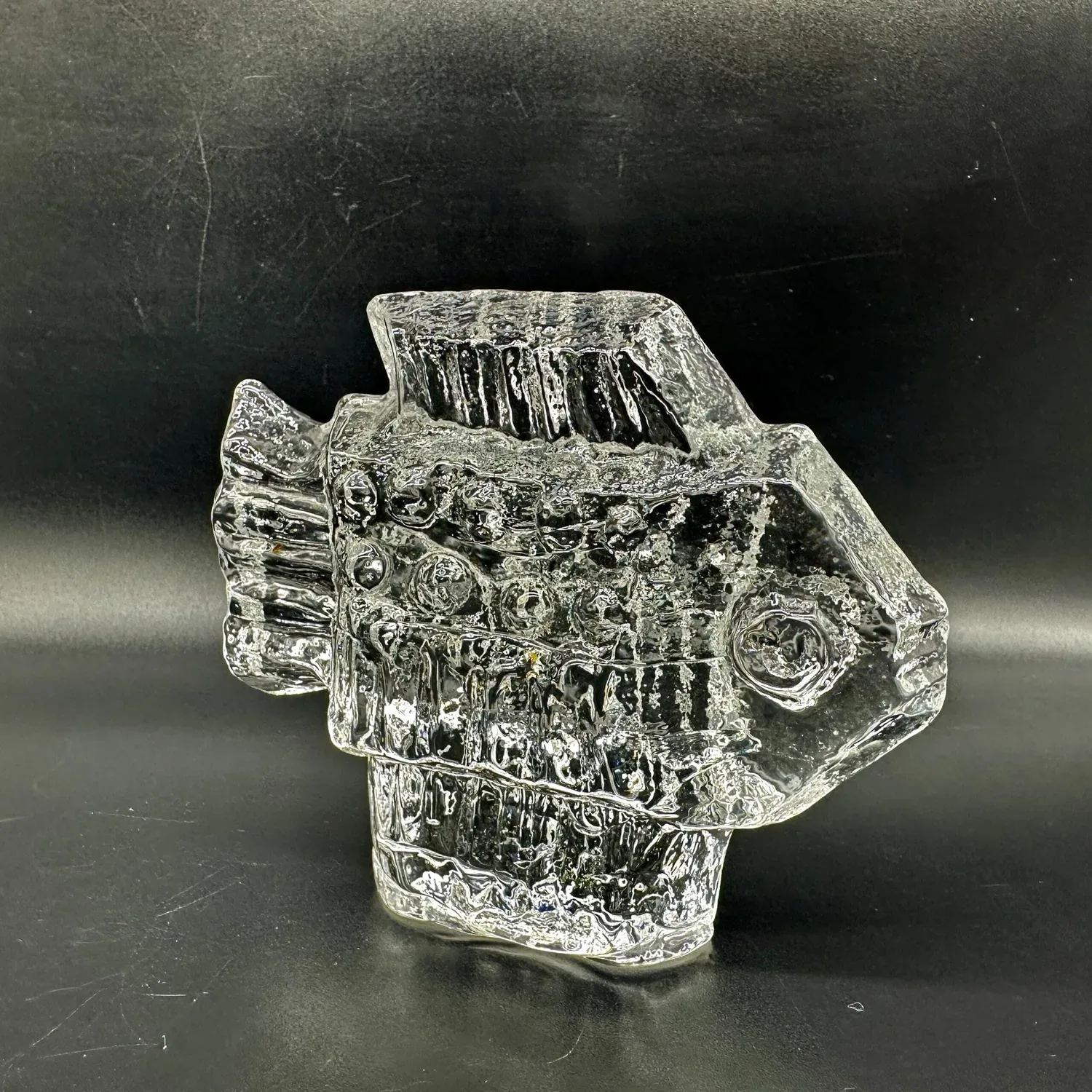 Exquisite vintage clear glass fish sculpture by renowned designer Lars Hellsten for Skruf, Sweden. This mid-century modern masterpiece showcases the timeless elegance and exceptional craftsmanship of Scandinavian design at its finest.