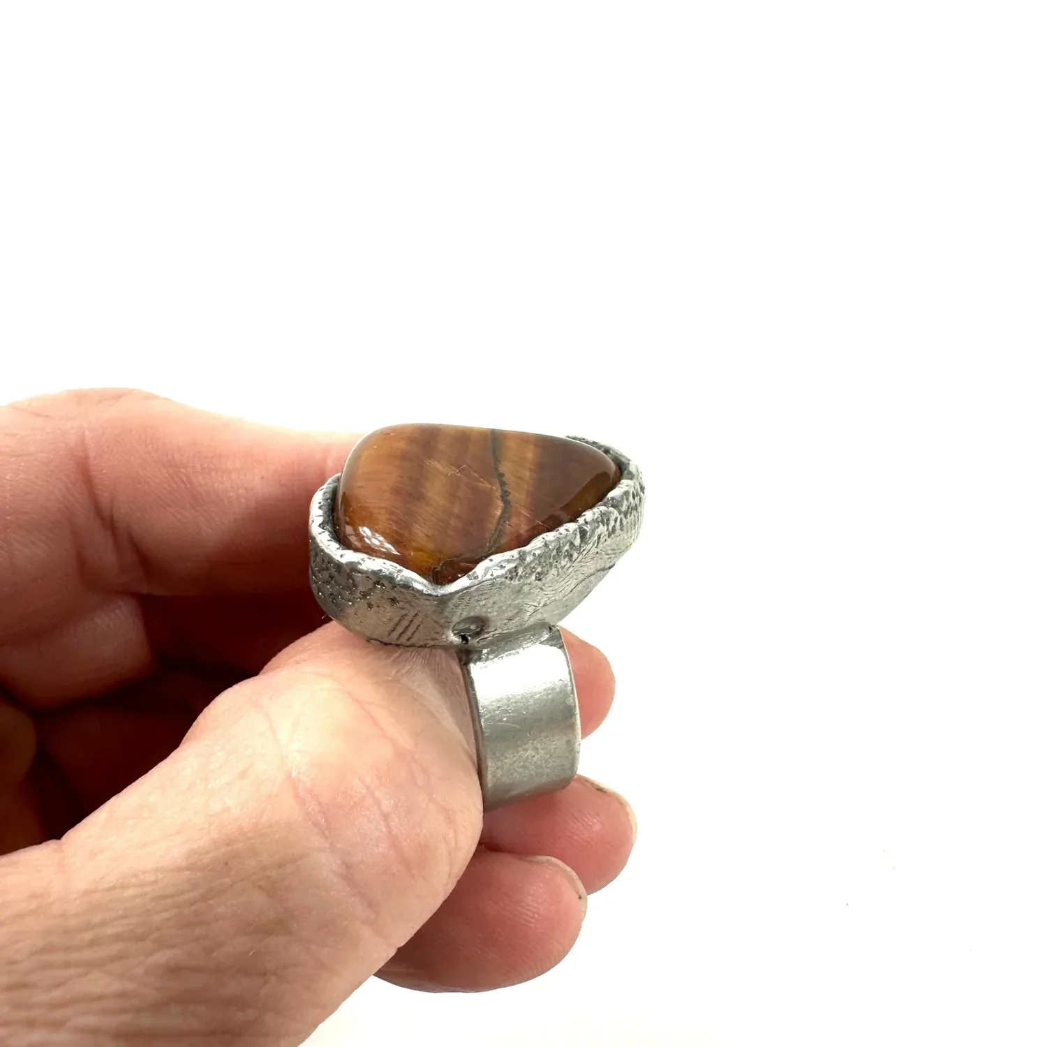 A magnificent example of 1970s jewelry artistry that brings natural beauty and vintage character to any collection. This Tiger’s Eye ring represents the decade’s celebration of earth-inspired design and bold personal expression.