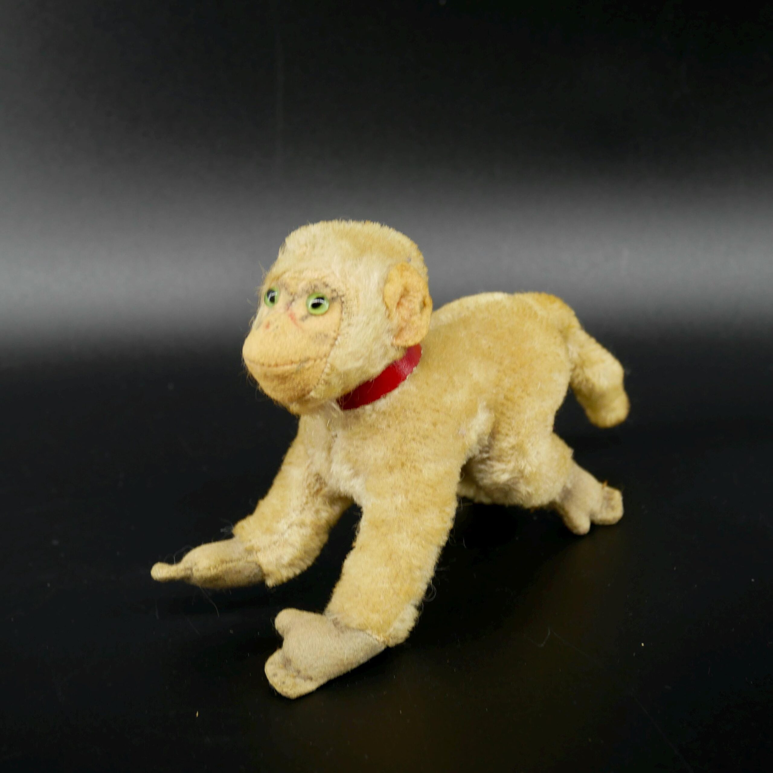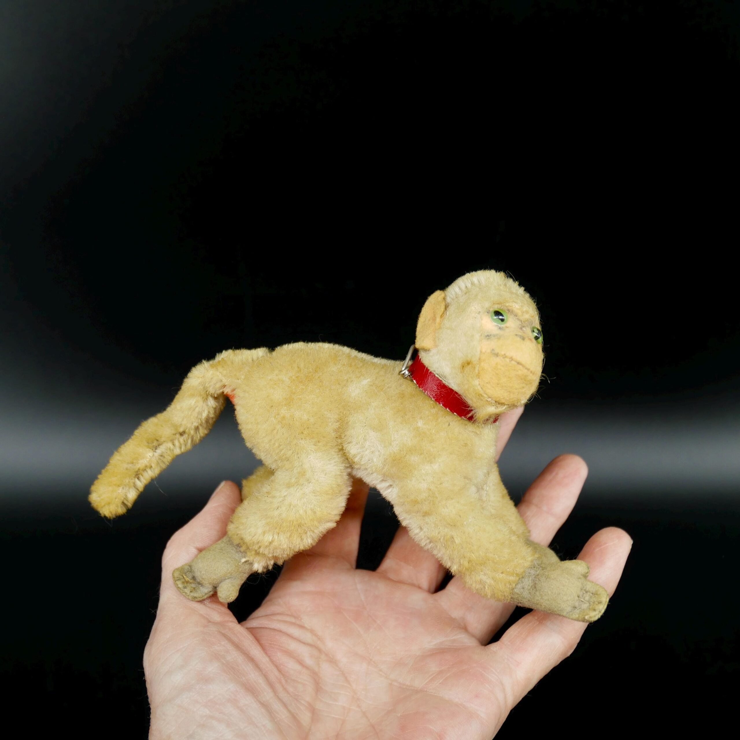 Rare Steiff baboon “Coco” from 1952-1964 with mohair fur, green glass eyes, and red collar. Exceptional mid-century German craftsmanship in excellent vintage condition.