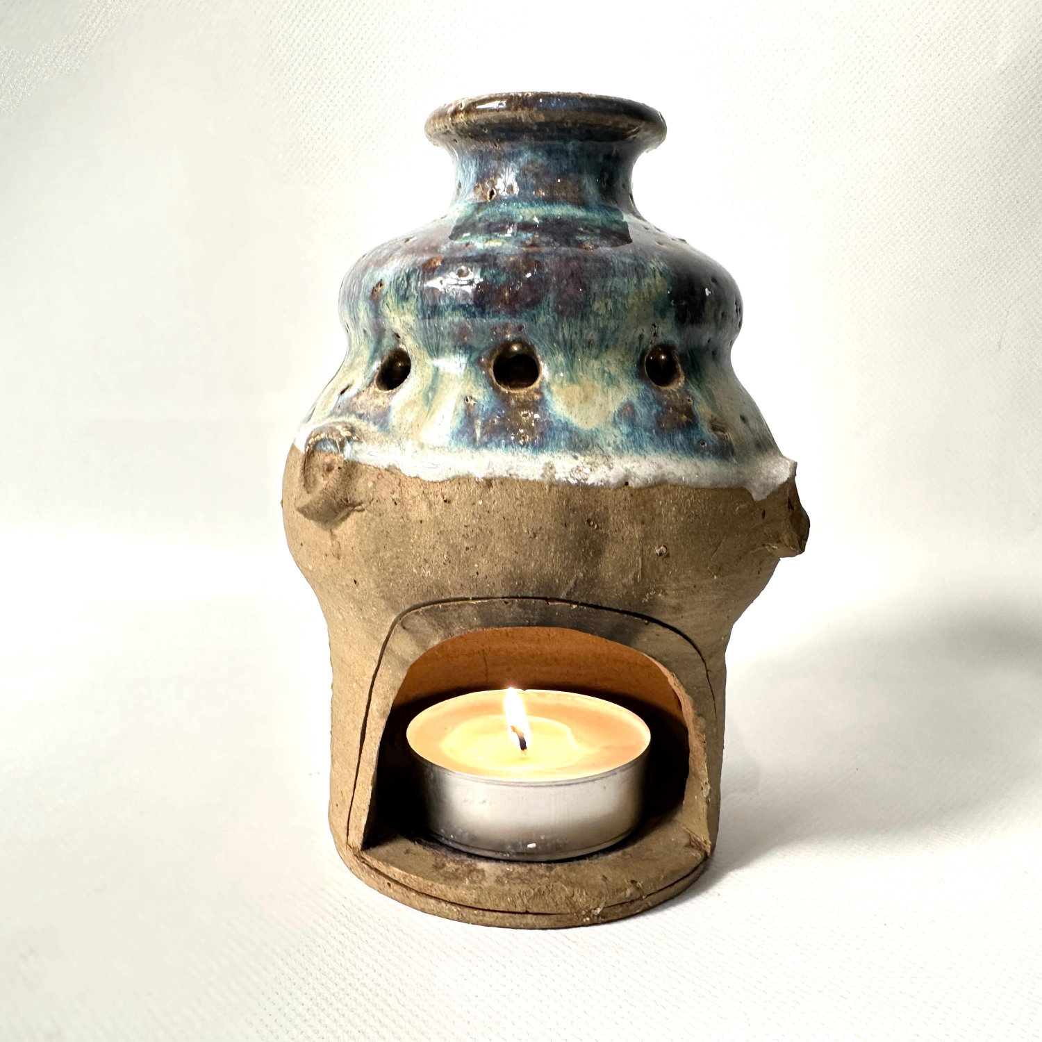 This hand-thrown pottery tealight holder by Uddebo Studio brings authentic Scandinavian craftsmanship to any space. The natural stoneware construction features a raw clay base complemented by a glossy glaze in blue, green, and earthy brown tones.