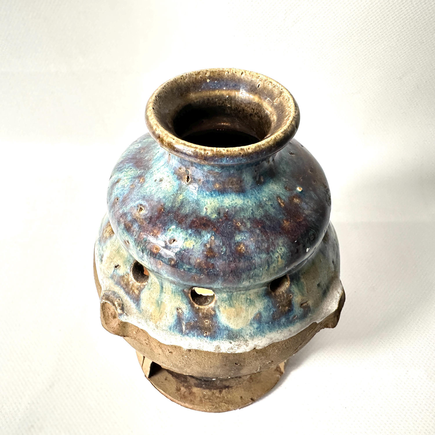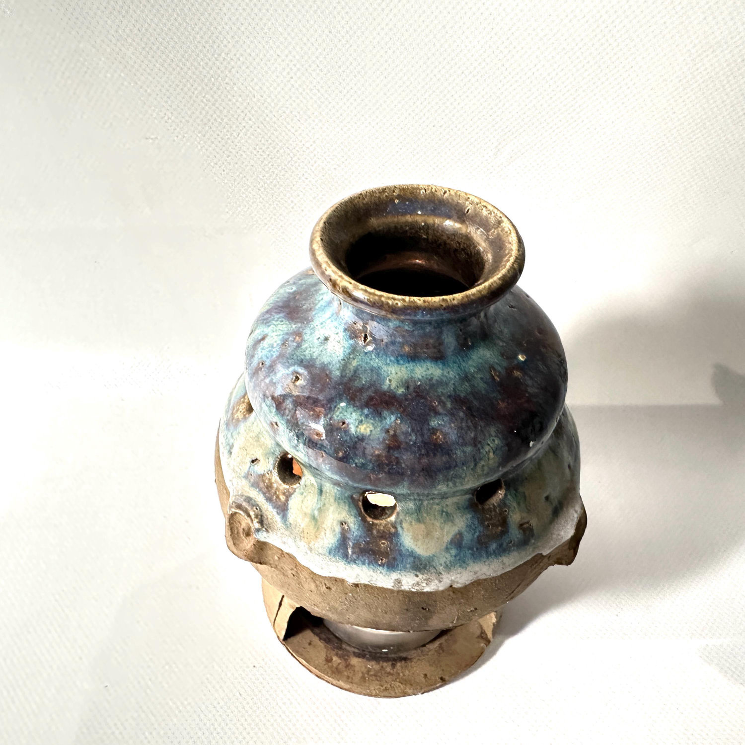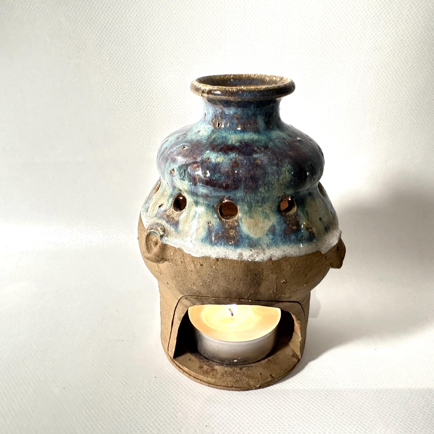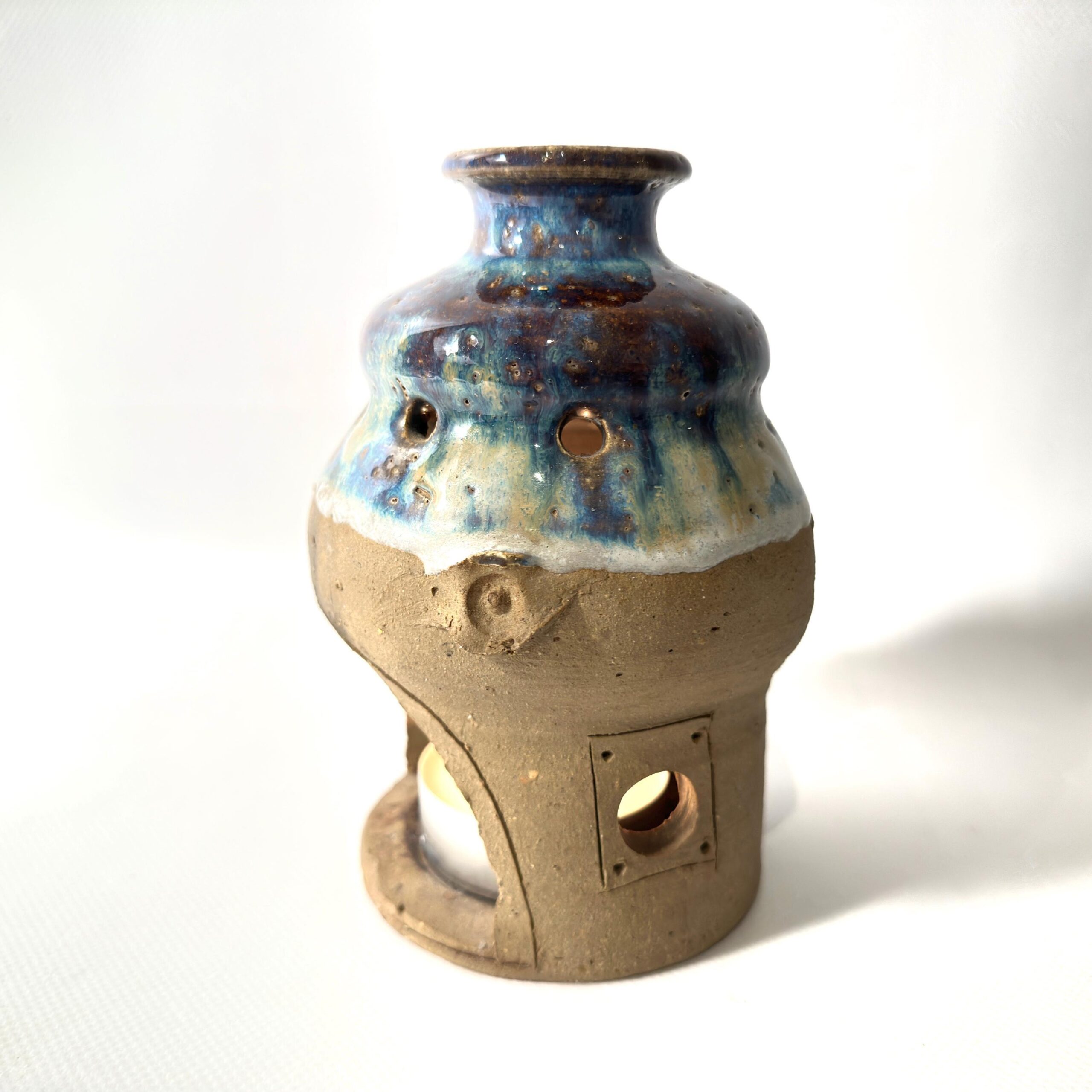 Hand-thrown pottery tealight holder by Uddebo Studio, Sweden. Glazed stoneware with perforated design creates beautiful diffused candlelight in blue, green, and earthy brown tones.