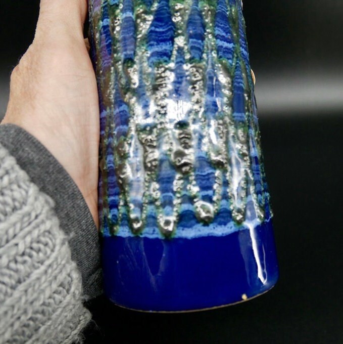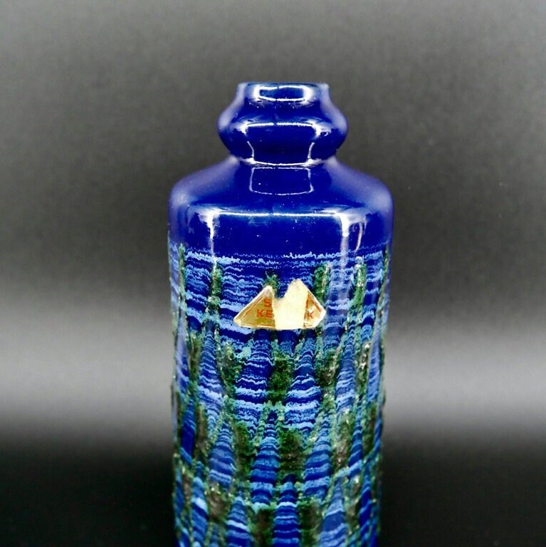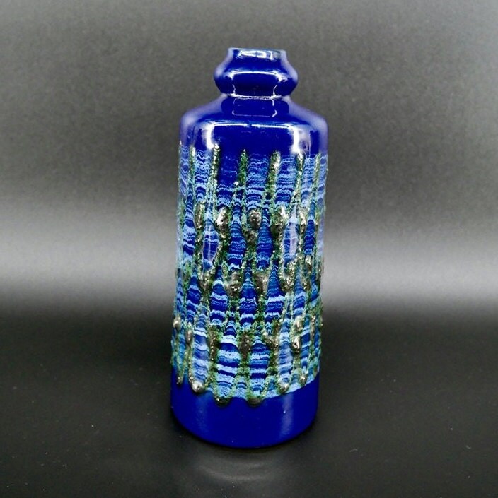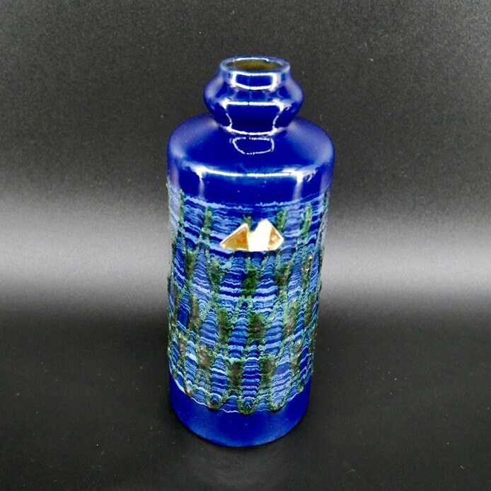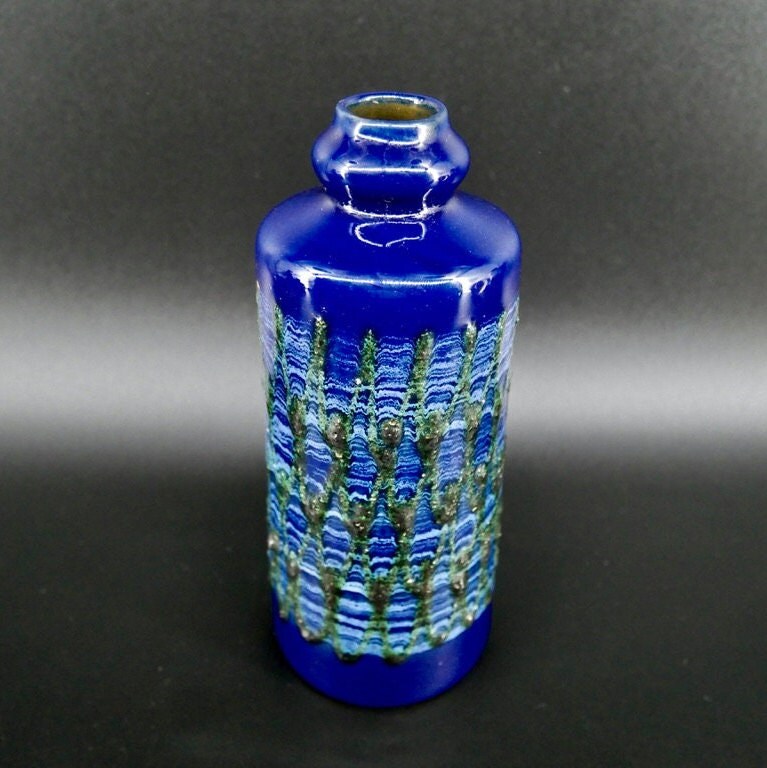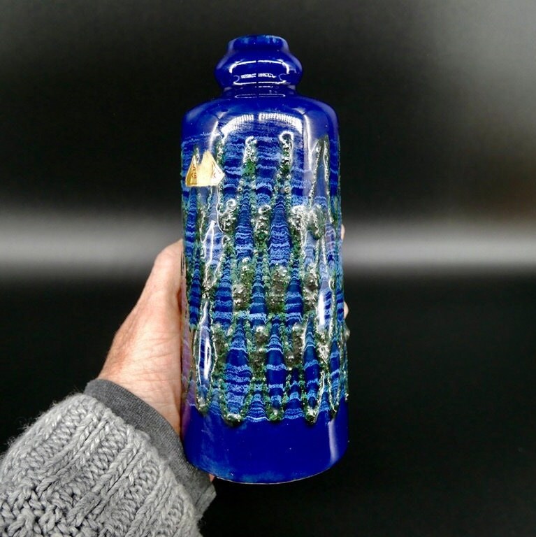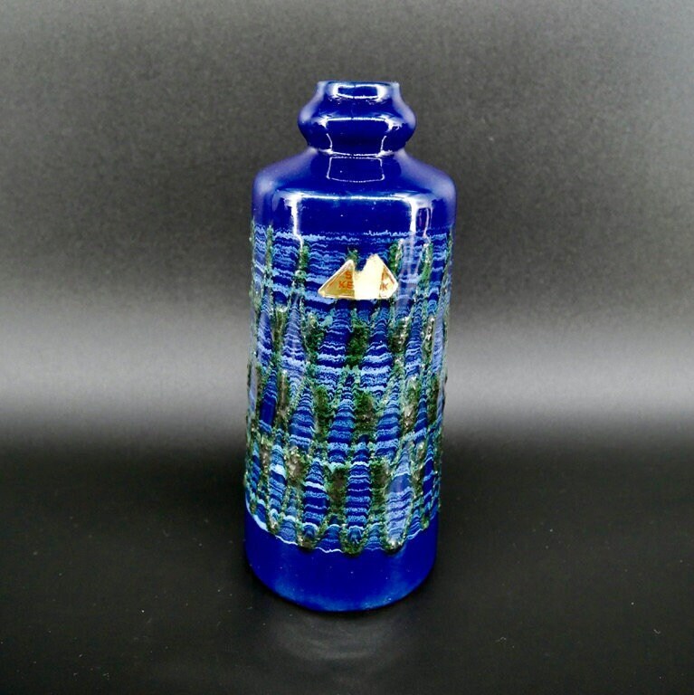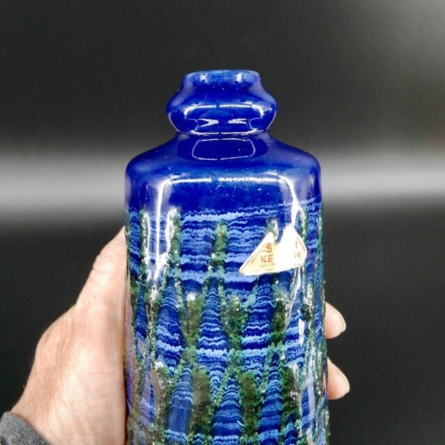 Discover the artistic heritage of Eastern Germany with this exceptional VEB Strehla ceramic vase featuring distinctive green fat lava detailing. This authentic piece showcases the craftsmanship of East German pottery makers and retains its original Sesam Keramik label, adding provenance and authenticity to this collectible vase.