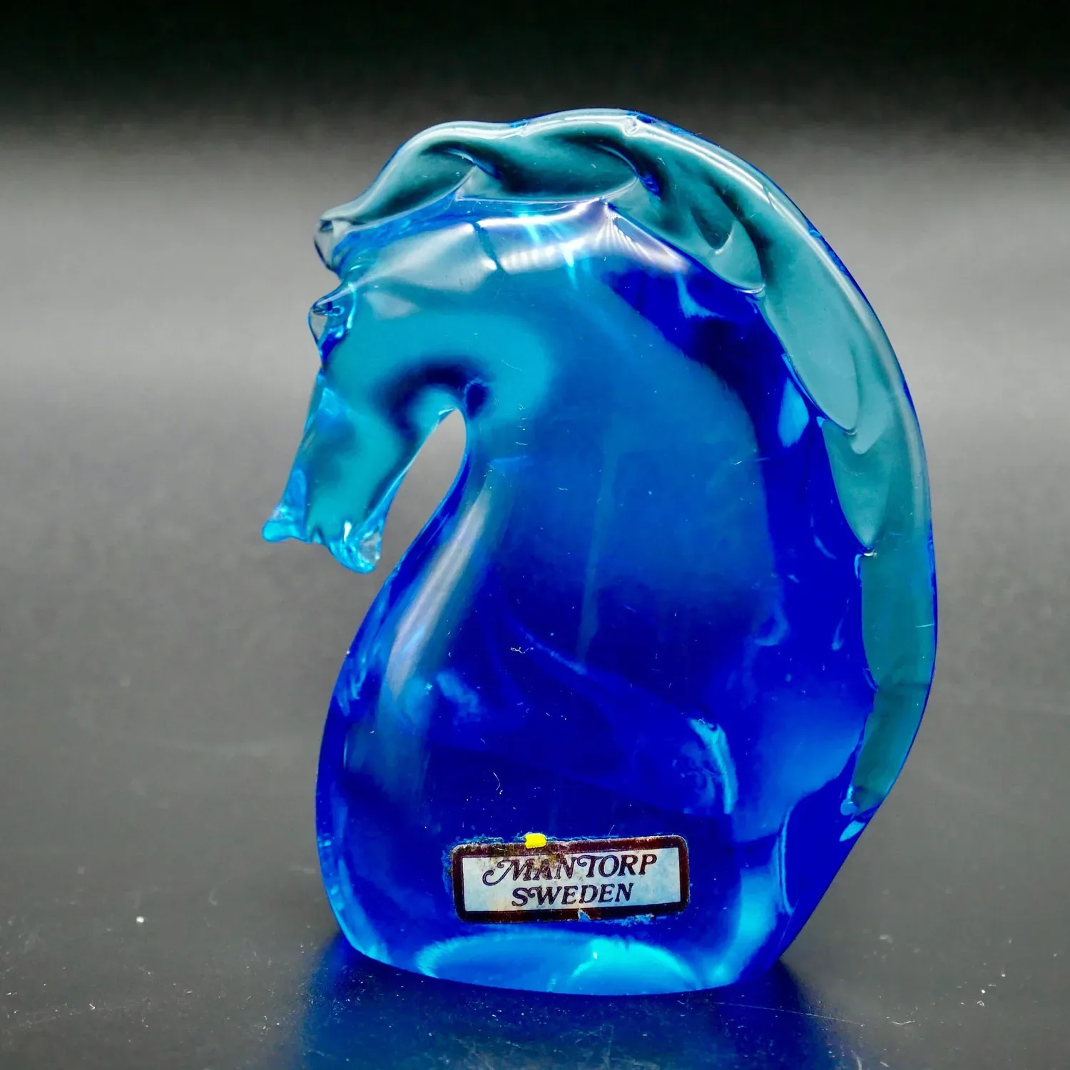 Authentic Swedish art glass horse head sculpture in stunning cobalt blue, handcrafted in Mantorp, Sweden. This beautiful animal figurine features the distinctive clarity and craftsmanship that defines Swedish glass artistry, complete with original manufacturer label confirming authenticity.