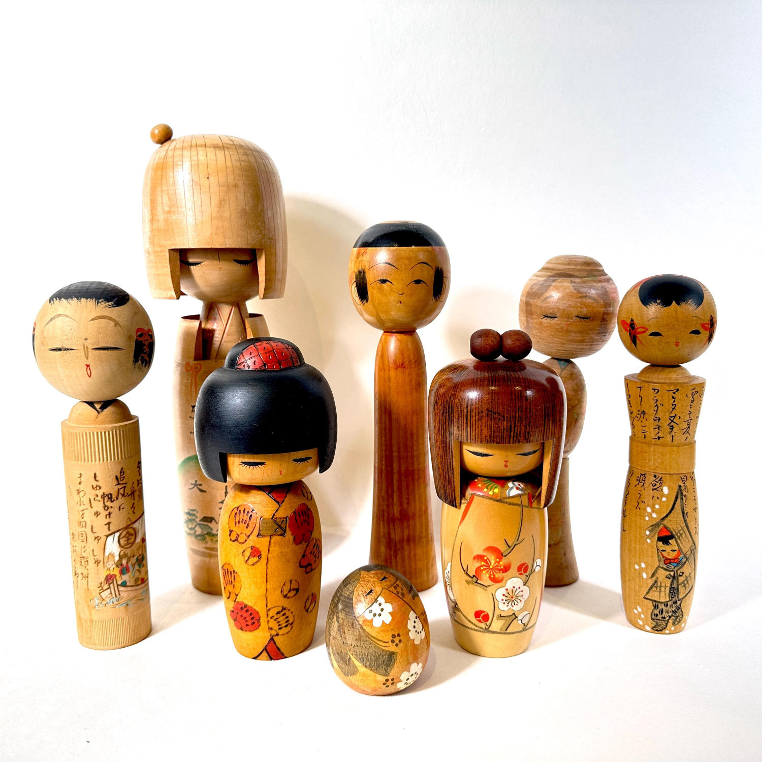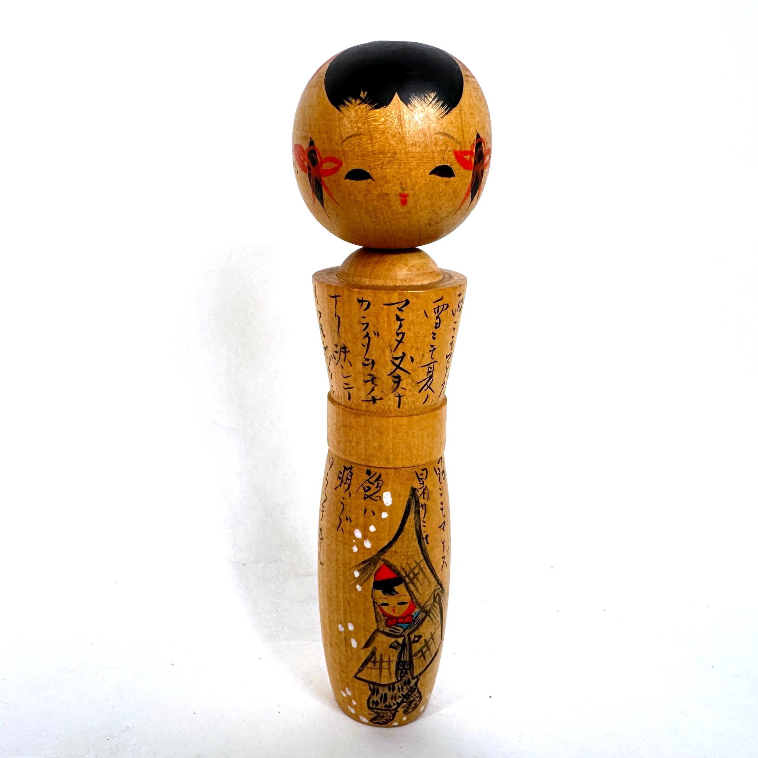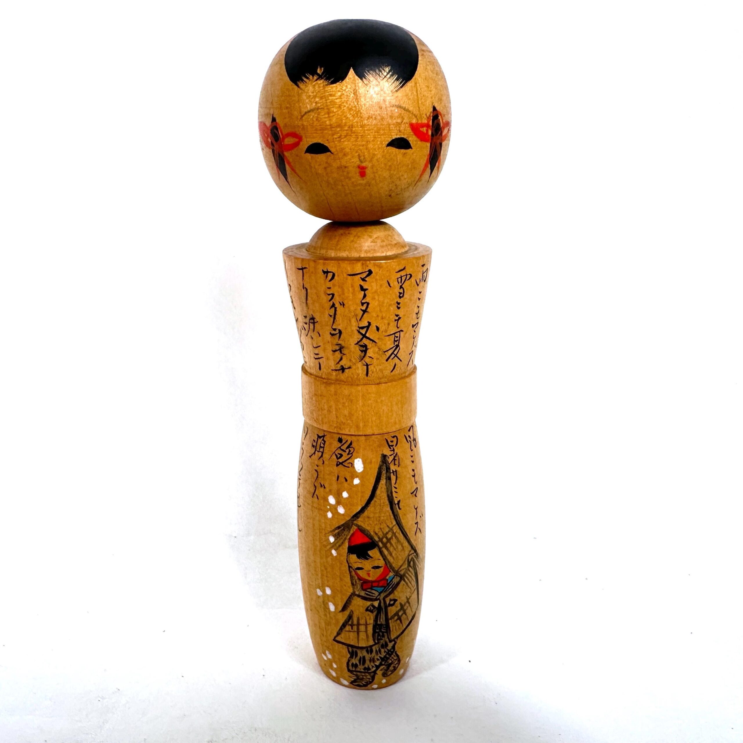 This piece makes an excellent addition to collections of Japanese folk art or as a distinctive decorative accent. The unique illustrated storytelling design and taller proportions set it apart from typical kokeshi dolls.