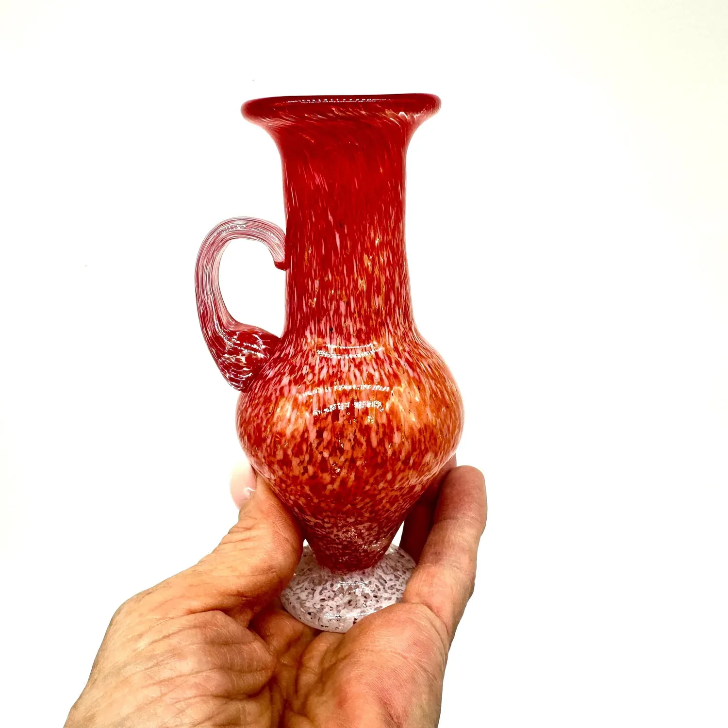 Exceptional signed Orrefors miniature red glass jug showcasing the finest Swedish art glass craftsmanship. This charming collectible features a distinctive speckled white base that beautifully contrasts with the vibrant red body and elegant clear handle.