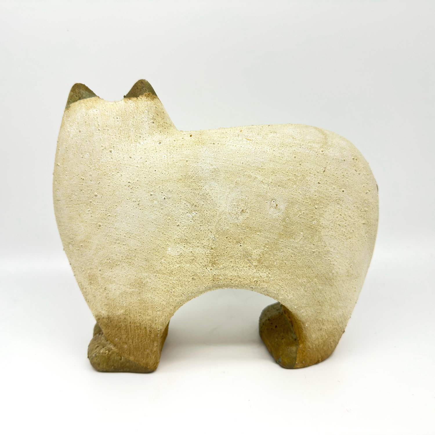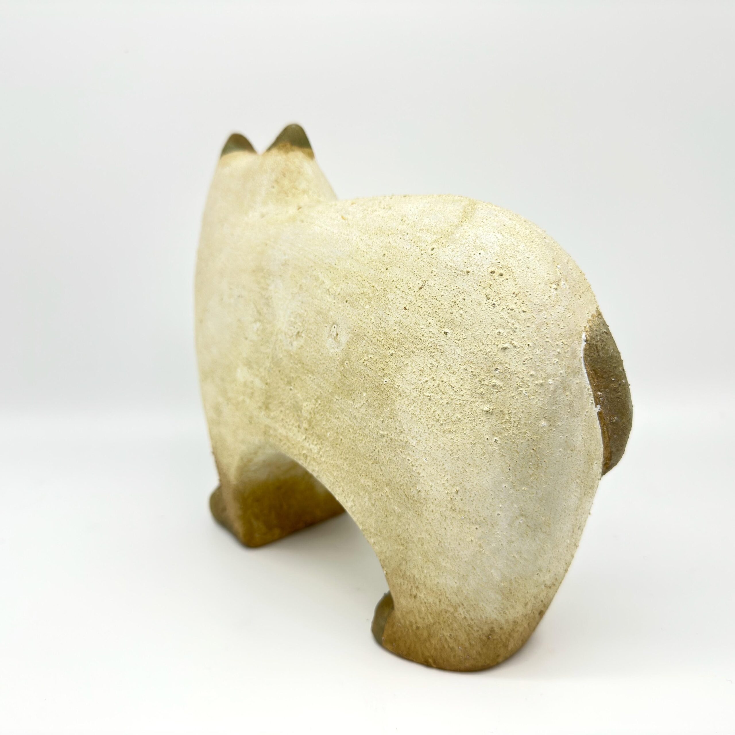 This charming ceramic cat sculpture brings timeless folk art appeal to any space. Crafted from glazed stoneware with a lightly textured surface, this vintage piece showcases sculpted facial features and a gently curled tail in soft off-white and greenish hues.